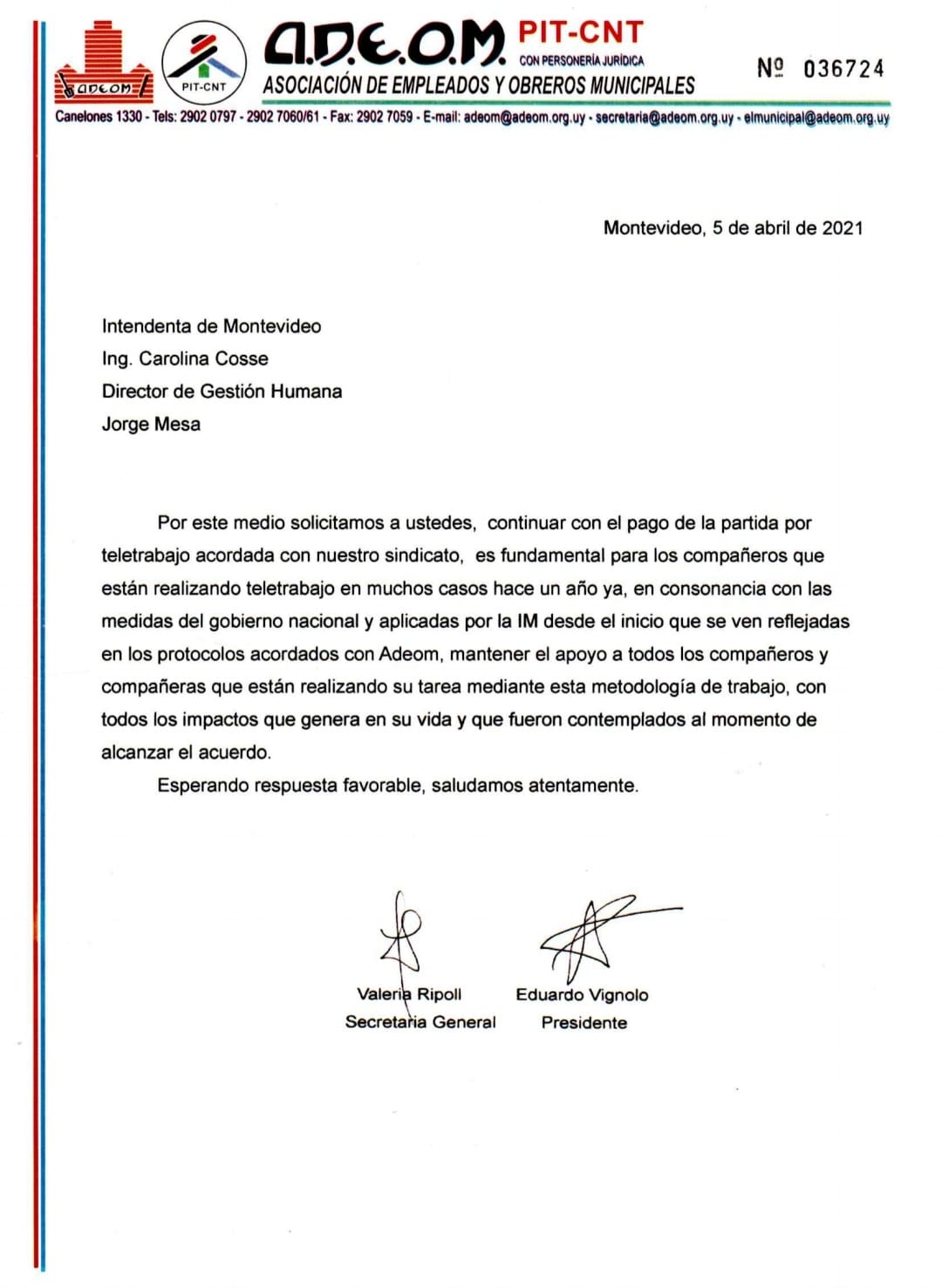 Carta de ADEOM del 5 de abril de 2021