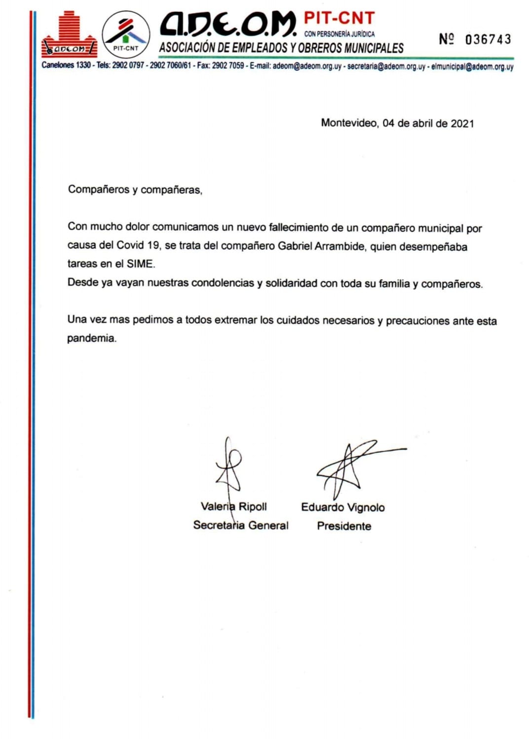 Fallecimiento del compañero Gabriel Arrambide