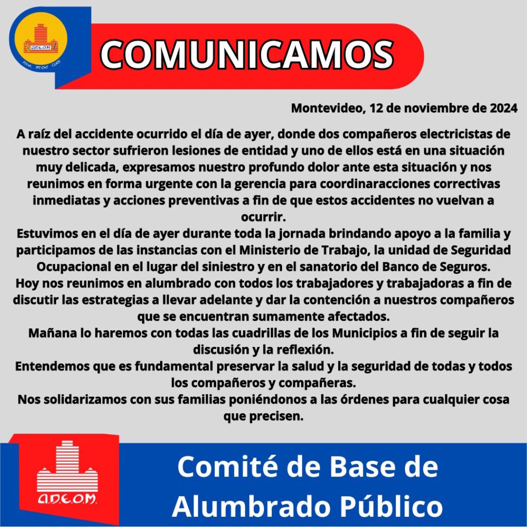 Comunicado respecto a accidentes de dos compañeros electricistas