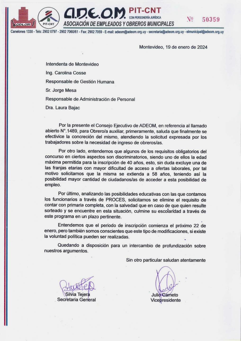Solicitamos a la Intendenta Cosse mayor inclusión al próximo llamado de obreros/as